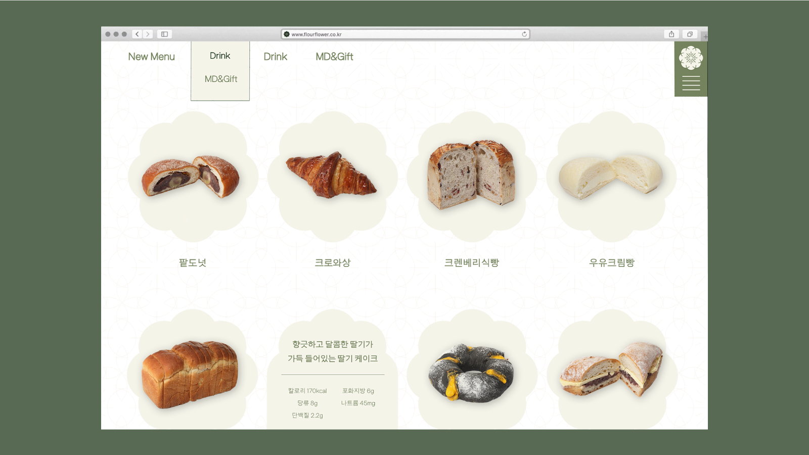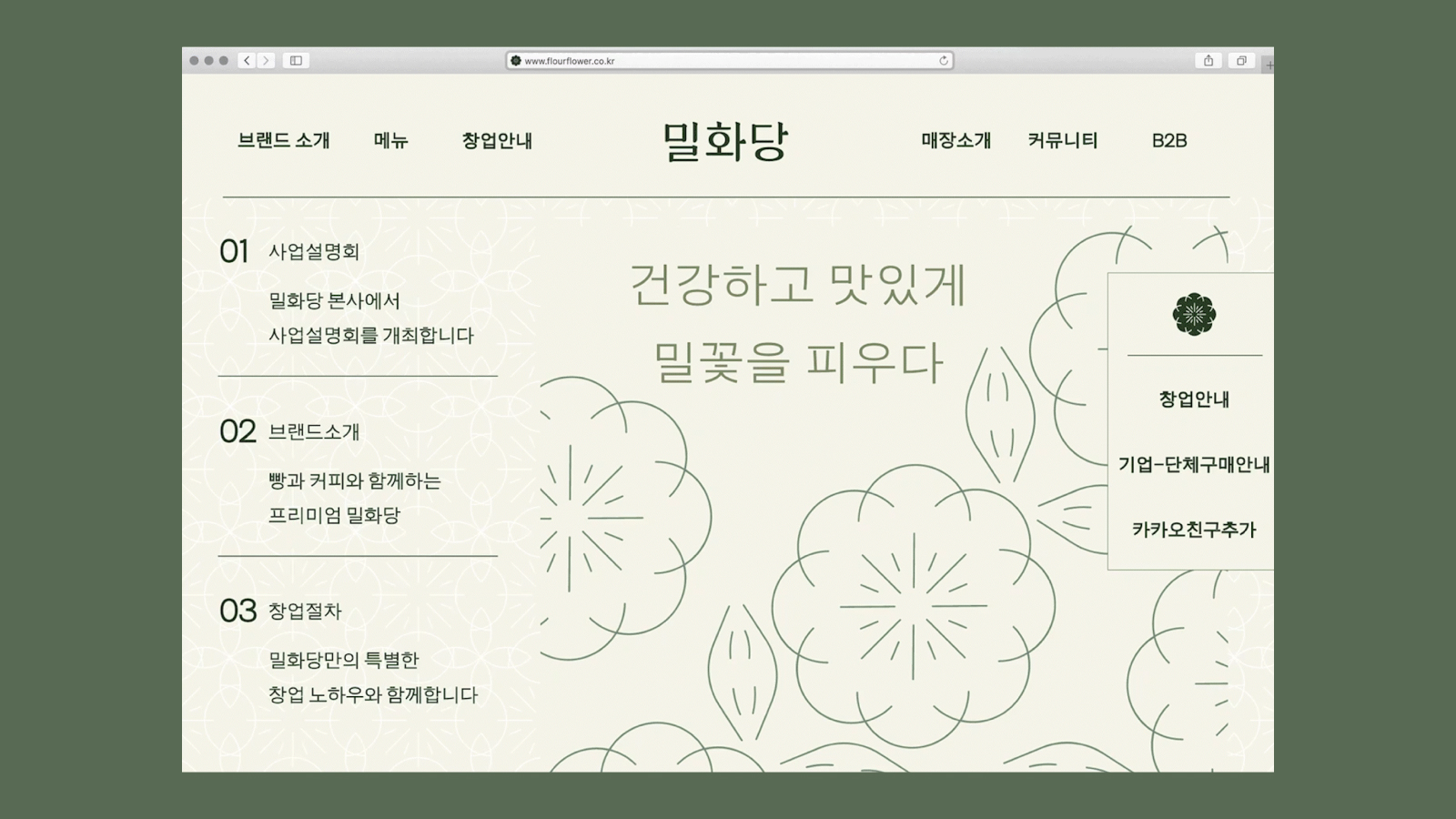 밀화당은 유기농 빵을 만드는 브랜드로 건강함과 따뜻함 그리고 자연스러운 가치를 브랜드에 담을 수 있도록 디자인했습니다. 밀화당의 로고는 밀의 알곡과 꽃을 결합하여 단정한 느낌을 전달합니다.