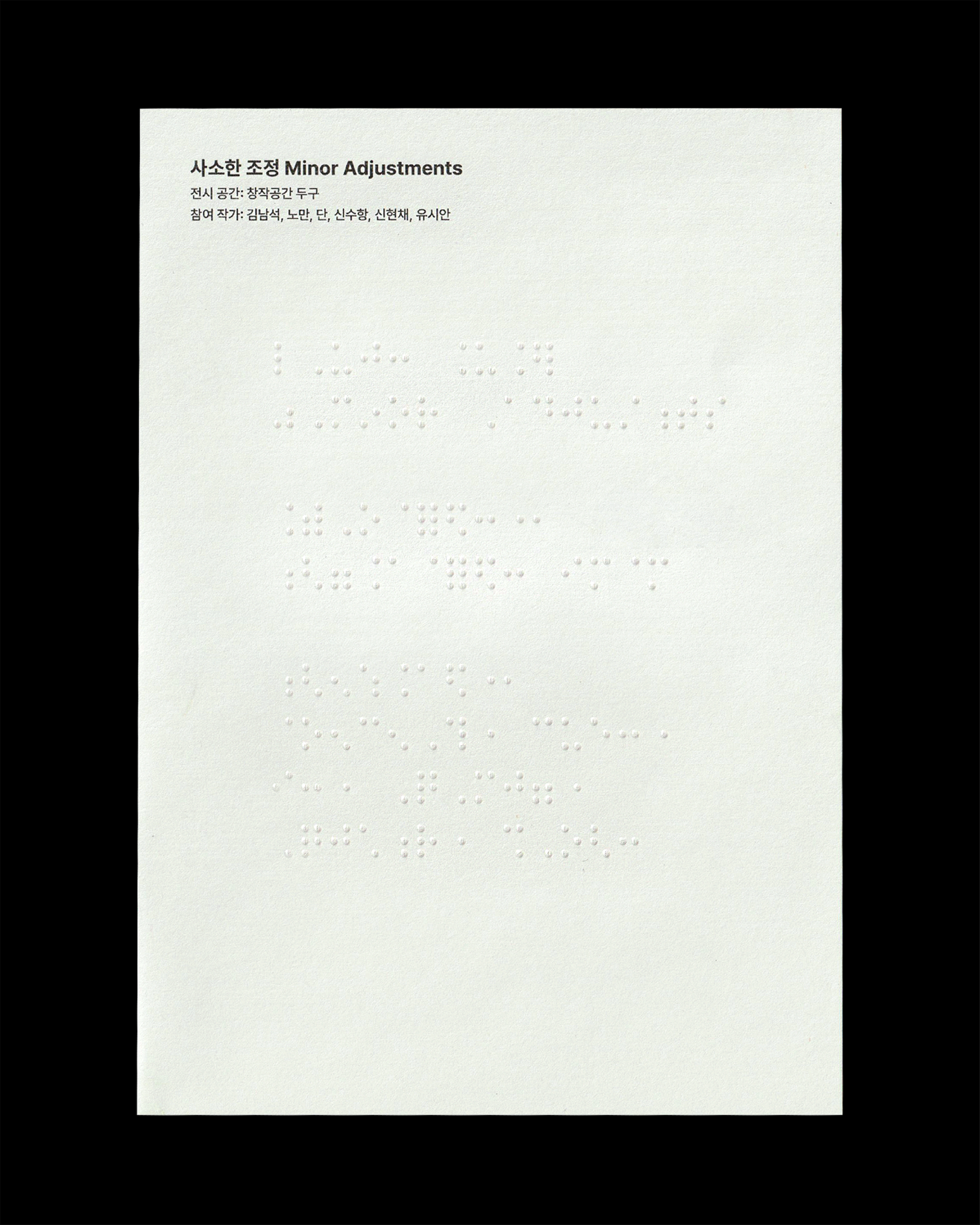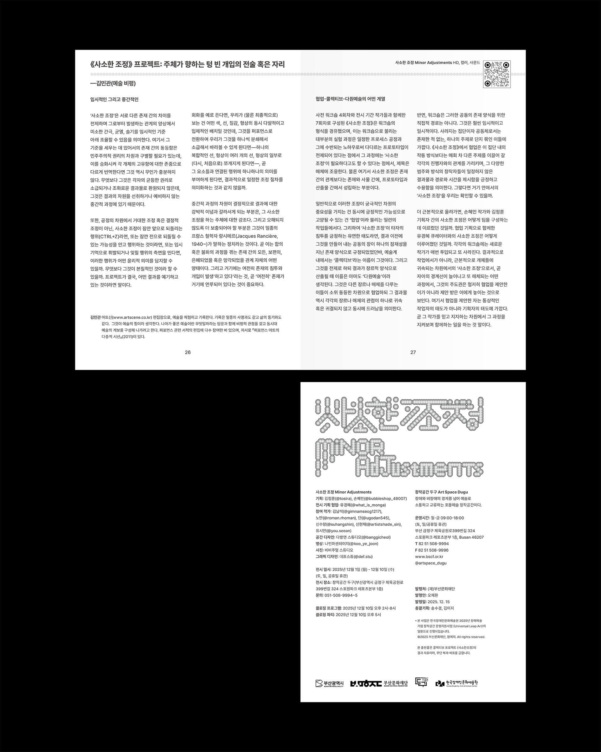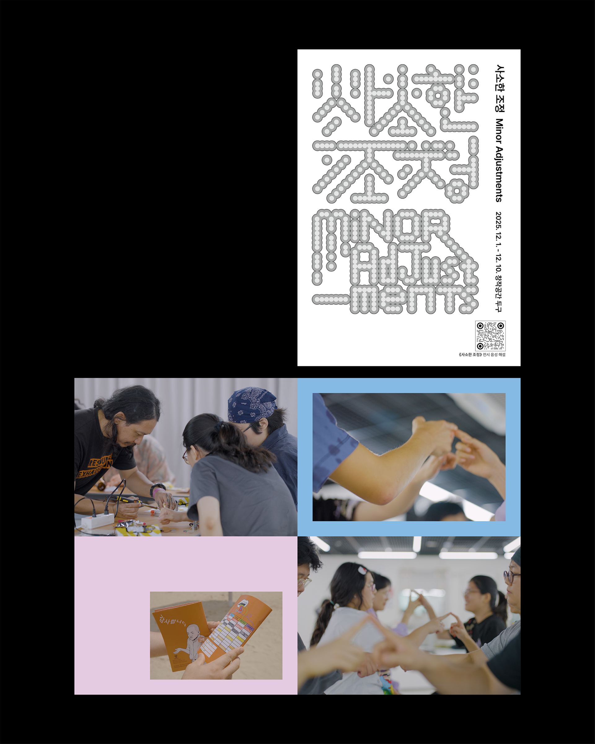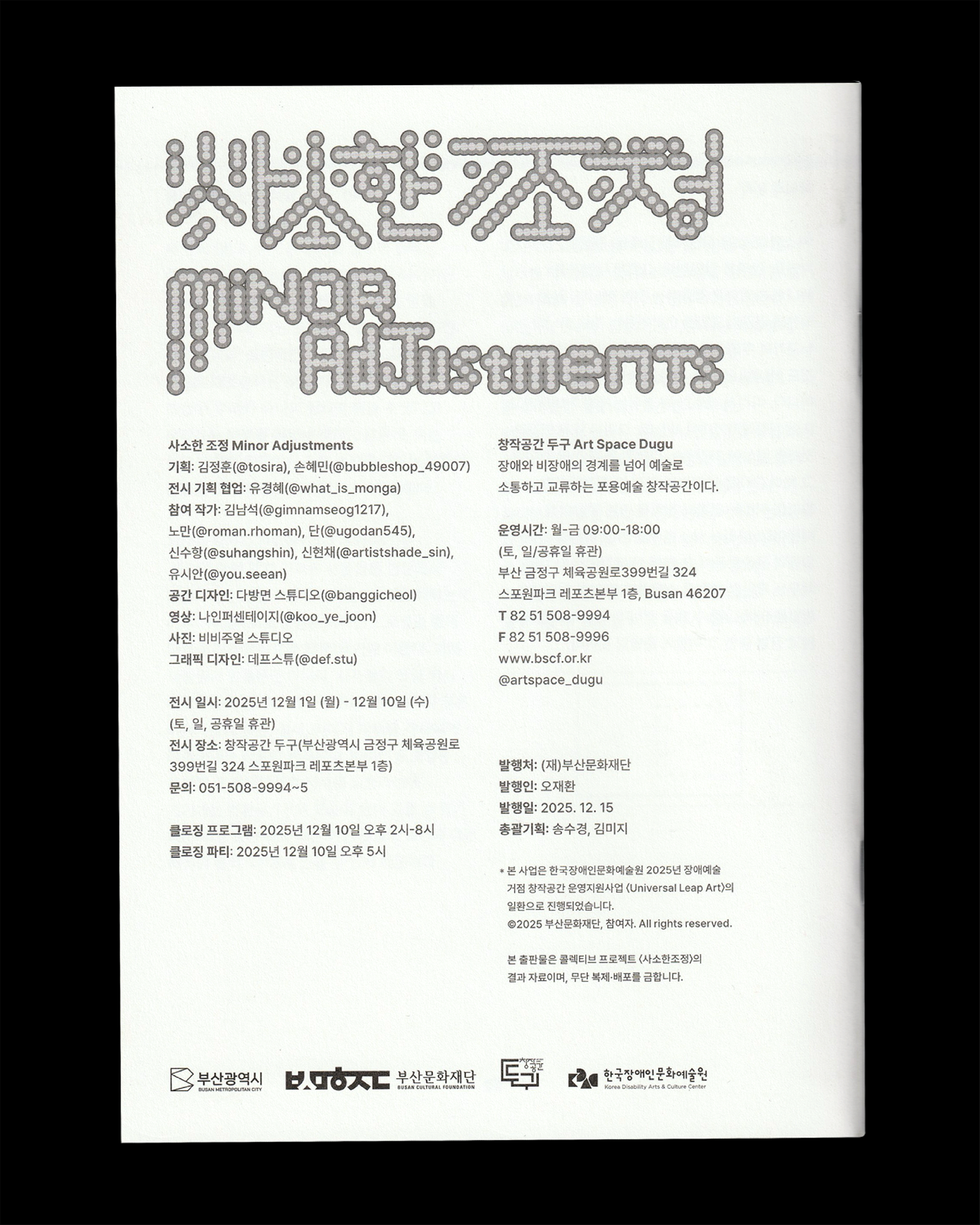 Graphic identity for the workshops and the final report exhibition of the 2025 Art Space Dugu Collective Project, ‘Minor Adjustments,’ organized by Busan Cultural Foundation.